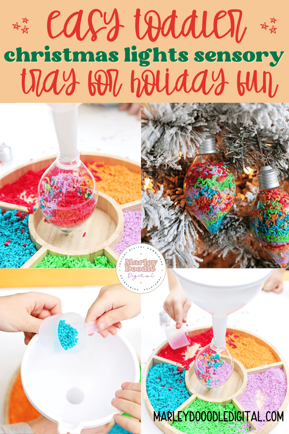 Fill the Bulbs – Let kids use a spoon or funnel to fill the clear light bulb ornaments with rainbow rice. They’ll love watching the layers build up like magic.