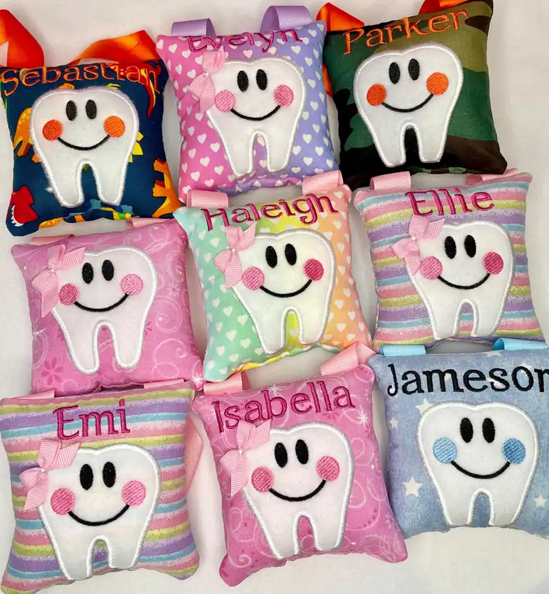 These adorable pillows are a fun and personalized way to celebrate losing a tooth! Each small pillow features a smiling tooth character with blushing cheeks and a coordinating ribbon for hanging on a door or bedpost.